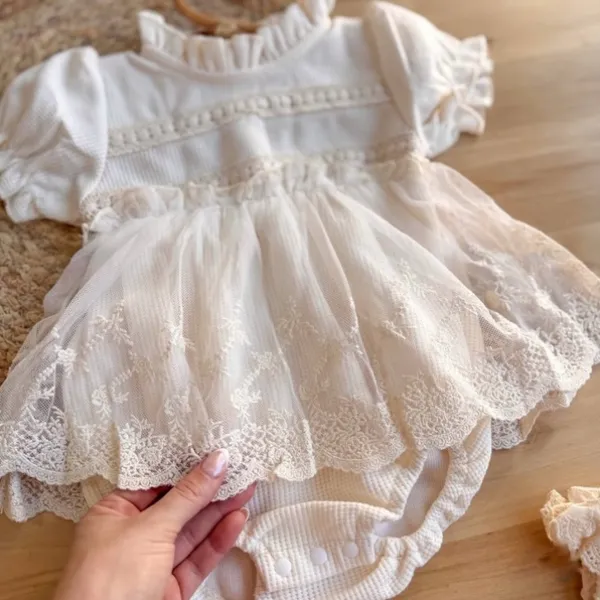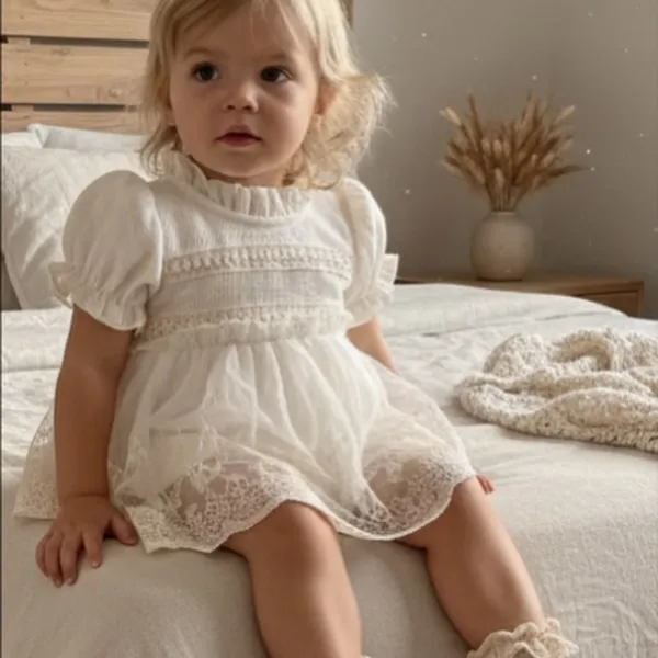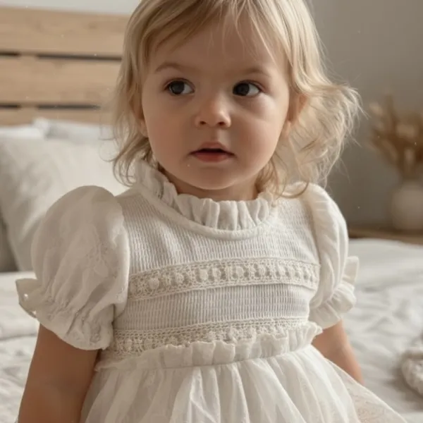 Създадена с внимание към всеки детайл, тази нежна рокля в цвят nude е перфектният избор за малки принцеси. Изработена от висококачествена вафлена материя, тя осигурява комфорт, мекота и елегантност през целия ден. Наборът около врата и фината дантела в долната част придават завършен романтичен облик.