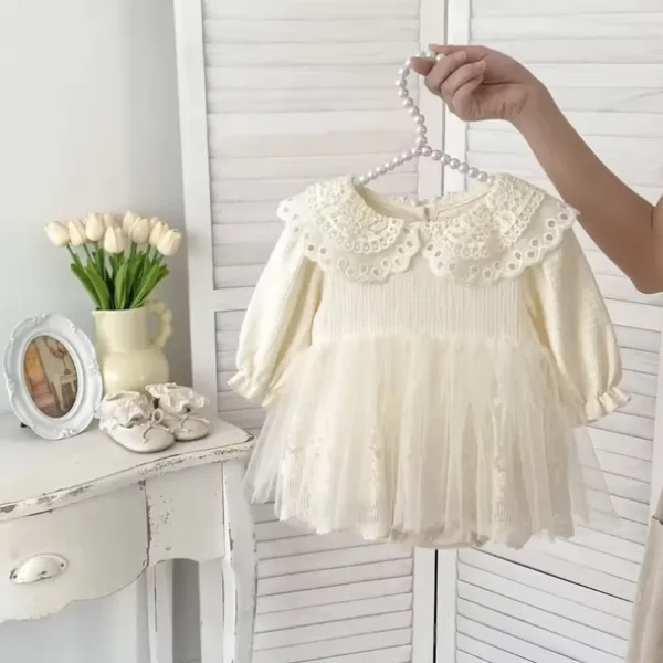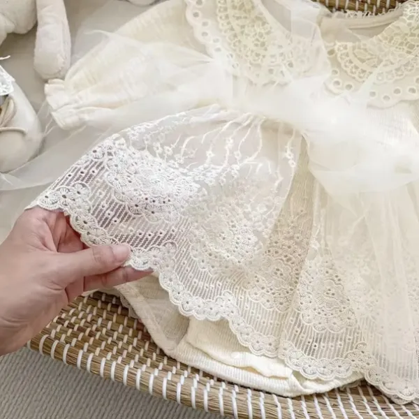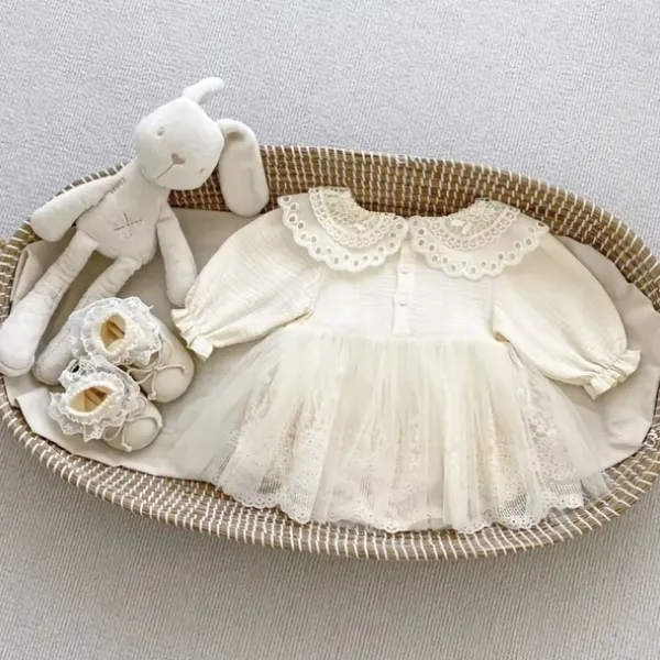 Елегантна бебешка боди-рокля в нежен кремав цвят – перфектният избор за специални поводи. Изработена от 95% памук, тя осигурява максимален комфорт за вашето дете, като същевременно впечатлява с изящния си дизайн. Дантелената яка, долната дантелена част и фин слой тюл отгоре създават неповторима визия, подходяща за празници, фотосесии или кръщене.