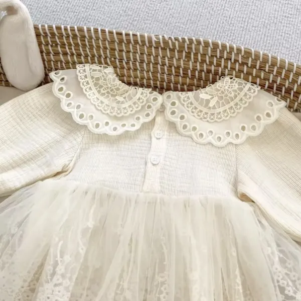 Елегантна бебешка боди-рокля цвят крем с дантела и тюл