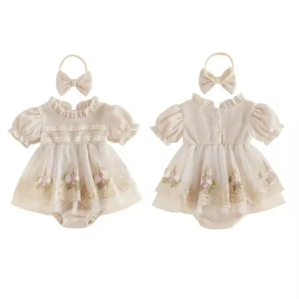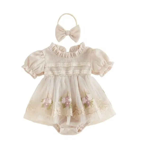 Комбинацията от елегантна бебешка рокля, бебешки комплект с лента за глава и ефирен тюл превръща този модел в перфектен избор за подарък или фотосесия.