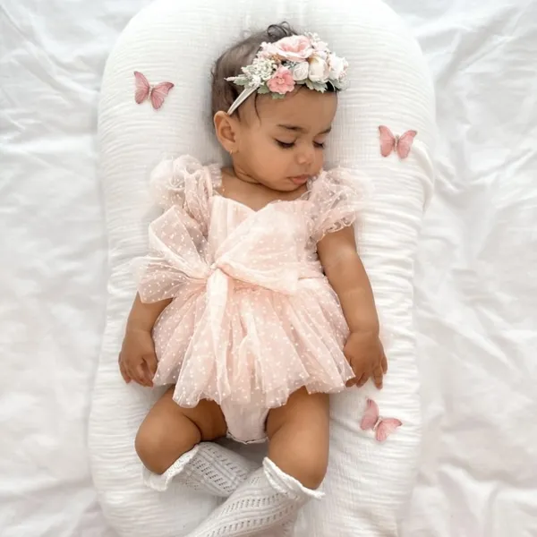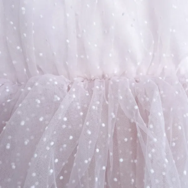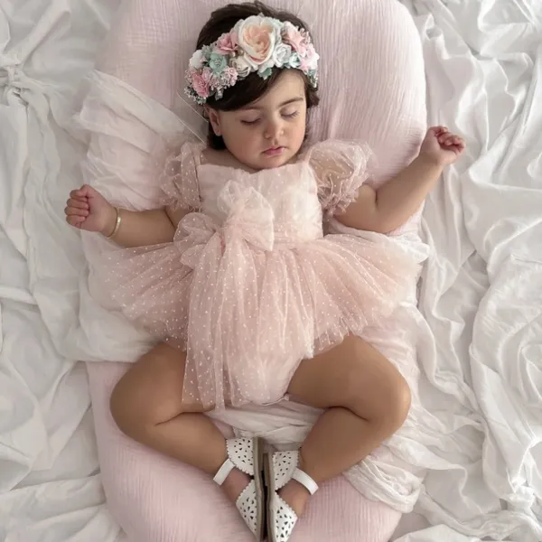 Тази бебешка рокля с тюл осигурява комфорт през целия ден благодарение на меката памучна подплата. Леките тюлени пластове придават обем без да утежняват дрехата. Практичното закопчаване прави обличането бързо и лесно. Идеален избор за родители, които търсят елегантни бебешки дрехи и удобни бебешки рокли.