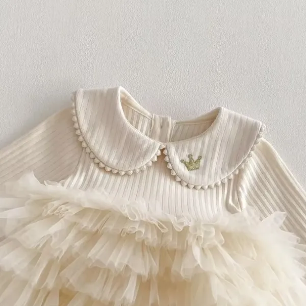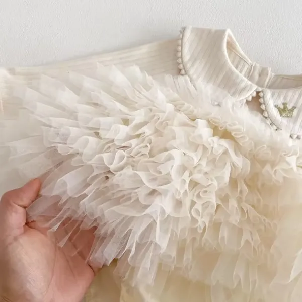 Бебешка боди рокля в кремав цвят, съчетаваща удобството на боди и елегантността на празнична рокля. Моделът впечатлява с ефектна тюлена пачка от няколко реда фин тюл и деликатна яка със златна коронка тип брошка – перфектен избор за специални поводи, фотосесии или стилна ежедневна визия.
