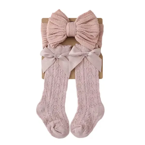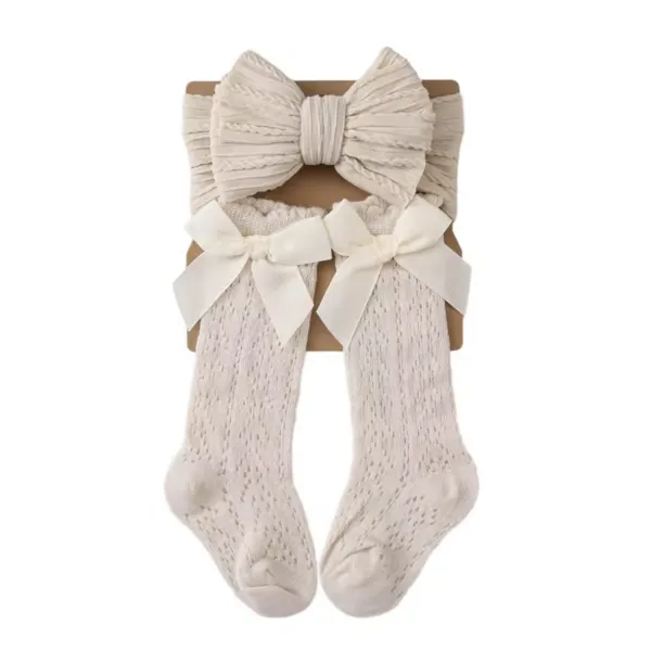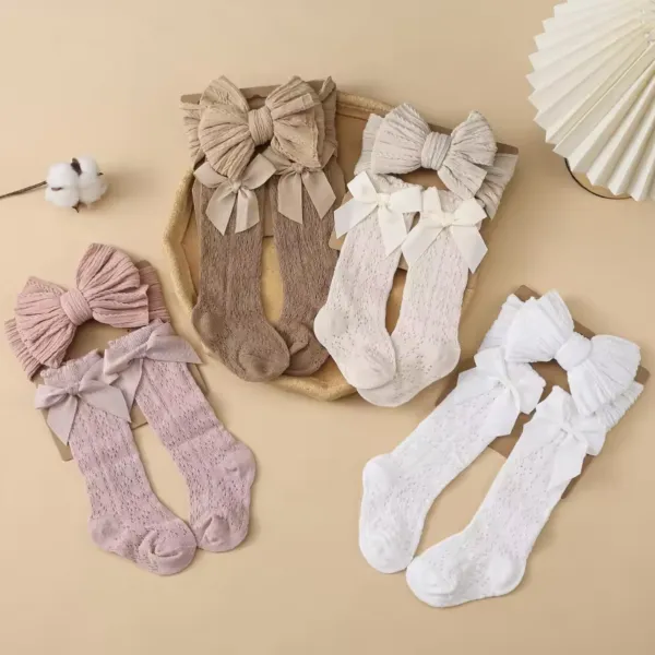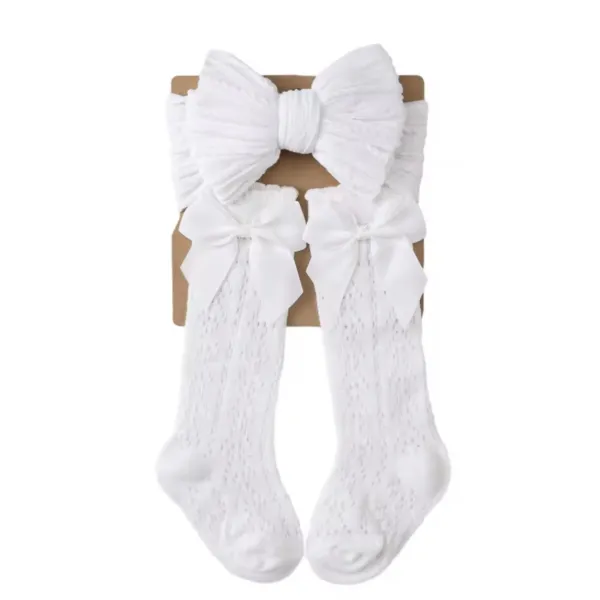 Този бебешки комплект аксесоари съчетава стил, удобство и практичност. Чорапките прилягат стабилно, без да се свличат, а лентата за глава не стяга и не оставя следи. Панделката придава завършен и сладък акцент към всяка бебешка визия.