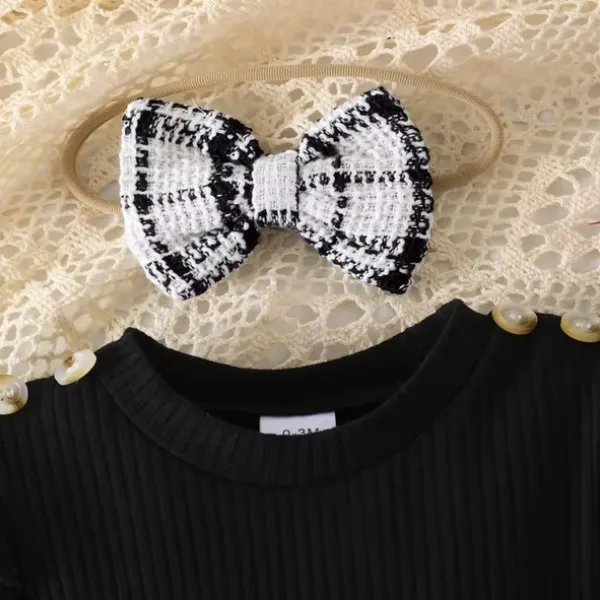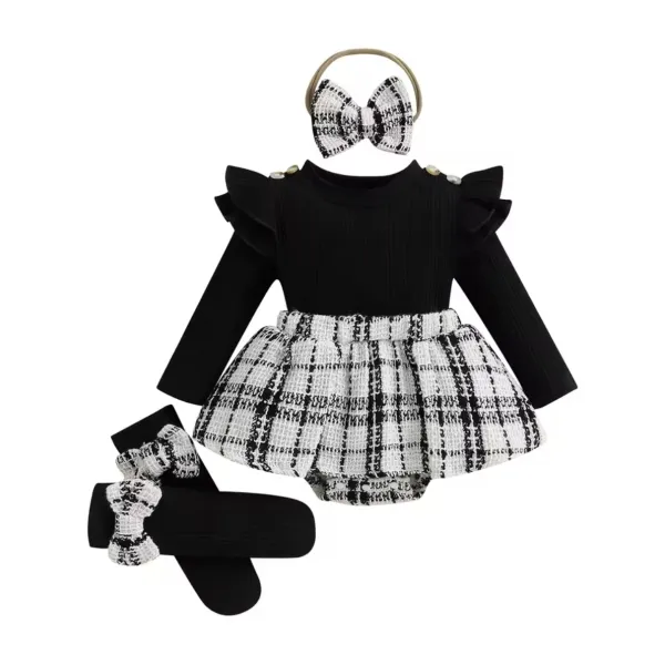 Бебешкият комплект Black-White Boucle съчетава елегантност и удобство в стилна комбинация от черно и бяло каре. Комплектът включва боди-рокля, чорапки с панделки и лента за глава, създадени с внимание към детайла, за да осигурят комфорт и стил на вашето малко момиченце.