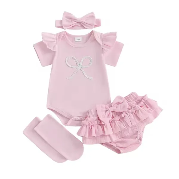 - Комплект от 4 части – боди, пола-панталонки, чорапки и лента за глава