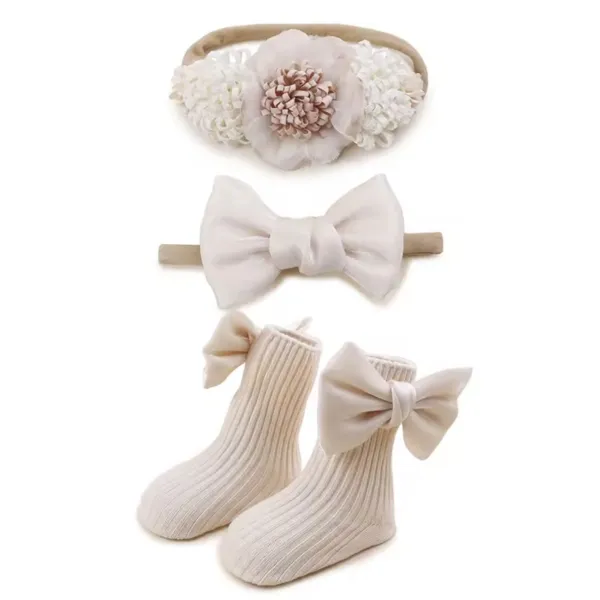 Този бебешки комплект е създаден за родители, които държат на стила и комфорта на своето дете. Лентите за глава подчертават нежността на бебешкото личице, а чорапките с панделки придават допълнителен чар. Перфектна комбинация за всеки специален повод или за ежедневна употреба.