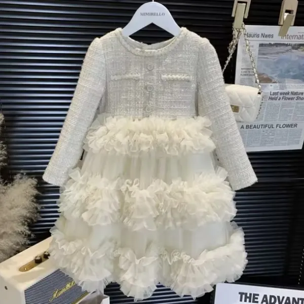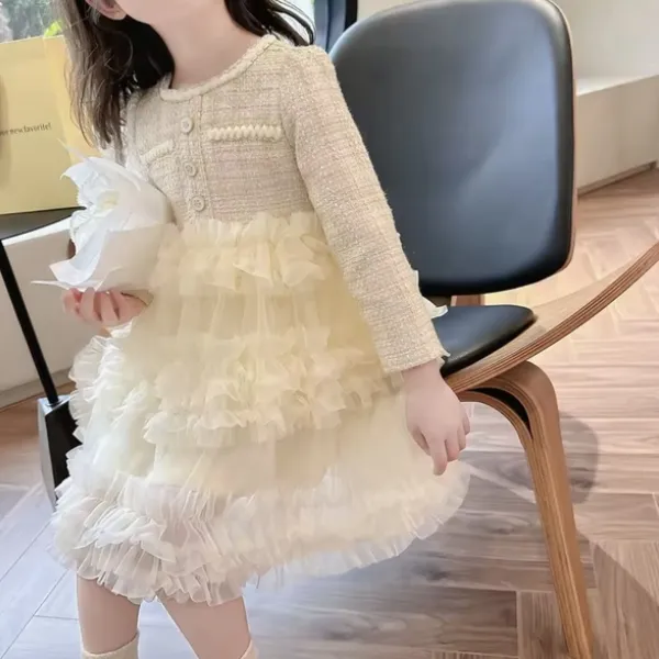 Детска рокля от букле в цвят шампанско с тюл и златни нишки — перфектният избор за празнични поводи и фотосесии. Изящната комбинация от букле в горната част и няколко пласта мек тюл в долната придава обем и ефирност, без да натоварва движението на детето.