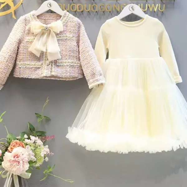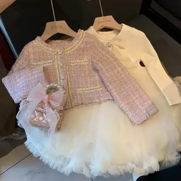 Добавете елегантност и стил към гардероба на вашето момиченце с този очарователен комплект – рокля с дълъг ръкав и ефирен тюл, съчетана със сако от букле с изискана брошка панделка. Подходящ за празници, специални поводи и фотосесии, този сет съчетава удобство и луксозна визия.