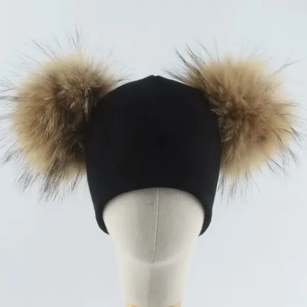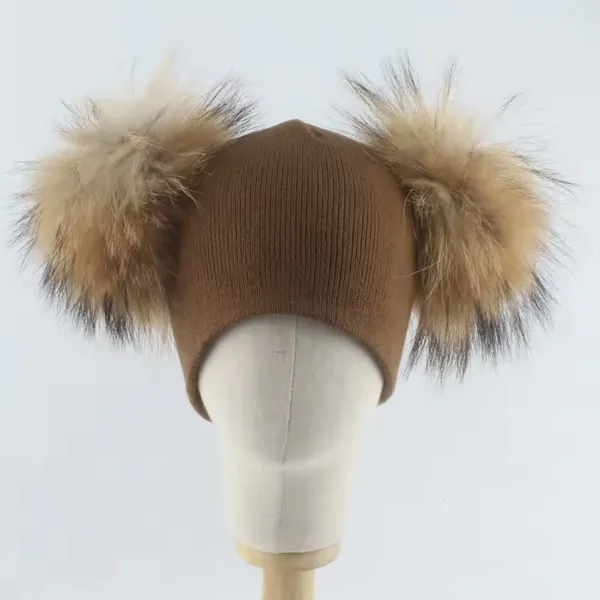 Шапка с два естествени помпона от ракун – топлина и стил за вашето дете